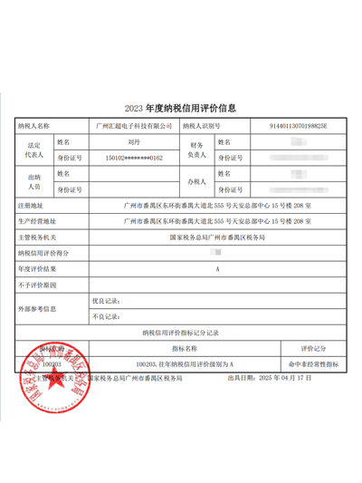 匯超電子-稅局A級證書